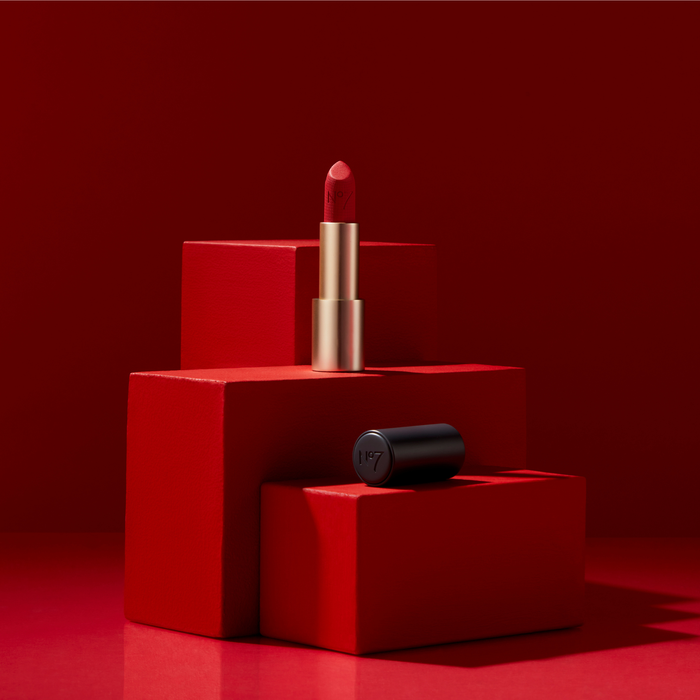 Step Six: To finish the look, sweep the No7 Pro Artist Matte Muse Lipstick in Red Carpet Ready over the lips directly from the bullet for a statement, velvety red lip look.
