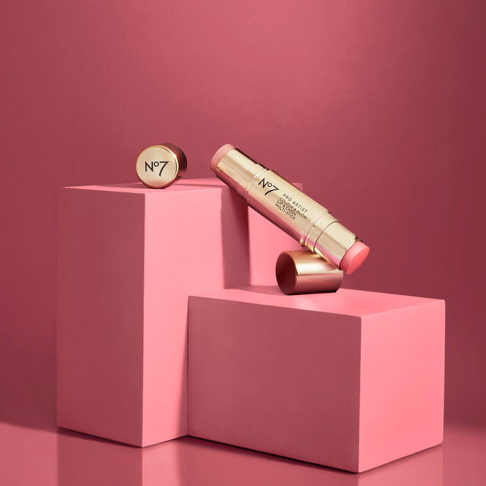 Step One: After applying your favourite No7 foundation (we recommend No7 Lift & Luminate Triple Action Serum Foundation), gently swipe each end of the No7 Pro Artist Colour & Glow Multistick in Peachy Coral & Rose Glow onto each cheek. Then, use your fingertips and gently pat into skin for a soft-focus glow.